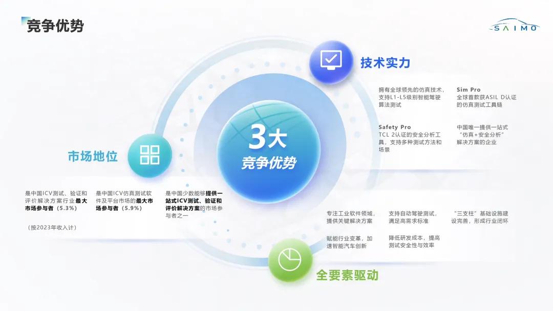 據(jù)介紹,智能網(wǎng)聯(lián)汽車(ICV)仿真測試領(lǐng)域具有廣闊的市場前景。根據(jù)弗若斯特沙利文數(shù)據(jù),中國ICV行業(yè)市場規(guī)模預計從2023年的1653億元增長至2030年的6596 億元,年均復合增長率約20.1%;其中ICV 測試、驗證和評價解決方案行業(yè)市場規(guī)模將以 33.6%的年均復合增長率增長至279億元。賽目科技致力于解決行業(yè)關(guān)鍵痛點,并持續(xù)創(chuàng)新,為行業(yè)提供全面的工具鏈解決方案。工具鏈以Sim Pro(仿真平臺)和Safety Pro(綜合安全分析工具)為核心,兩款產(chǎn)品已通過ISO 26262標準的功能安全認證,成為賽目科技技術(shù)壁壘和利潤增長點的重要組成部分。憑借技術(shù)優(yōu)勢和市場前瞻性,賽目科技正成為智能駕駛從概念邁向規(guī)?;涞氐摹半[形引擎”,也是這一高速增長中的最大受益者。